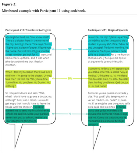 The CAB was invited to participate in a data analysis meeting scheduled for 3 hours, allowing ample time for meaningful engagement. During this meeting, we employed three focused strategies to ensure successful community participation in data analysis. We first built community rapport through creating psychological safety. Second, we established a common language for qualitative data analysis by leveraging common social media language. Third, we utilized a dynamic visualization board to keep the community engaged throughout the process. Our stakeholder community group convened on July 14th, 2023, to participate in a data analysis activity. The community had previously met twice to provide feedback on interview instrument and recruitment strategies. As an established group that had guided the project over the past year, the CAB was well position to contribute to this third gathering where the primary goal was to inform the data analysis by providing direct input on the codebook. About ¼ of the transcripts have been analyzed in NVIVO that informed the development of the codebook presented. During this meeting that was in English, the CAB’s role was to review the codebook presented in both English and Spanish at a third grade reading level to answer what might be missing, what they liked, and what was unclear.