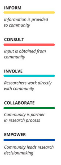 Borrowing Vaughn and Jacquez’s (2020) ‘Participation Choice Points in the Research Process’ diagram[2], I visually summarise the levels of community partner participation employed in Phases 1-8 in Figure 4[3]. Vaughn and Jacquez’s description of levels is mentioned in Figure 5, where ‘Inform’ is the lowest level of participation and ‘Empower’ is the highest.