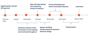 For this study, the lead teacher was the primary community partner. In line with a PR approach, the researchers sought to achieve full and equitable participation of the lead teacher in the research process. They made a continued effort to include the teacher from the very beginning by asking questions about preference for involvement at each stage of the research process. The lead teacher played a key role in allowing access to the classroom and preschoolers. Given the short period of time the researchers had for the project, it was important to build rapport and effectively communicate with the teacher (see Figure 1 for timeline).