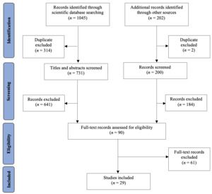 Following the Joanna Briggs Institute guidelines (Peters et al., 2020), two independent authors screened the selected studies (N = 1247) in two stages, after removal of duplicates (n = 316). For instance, the screening process was initially completed by a PhD student and a university professor, and finally updated by an additional PhD student. First, titles and abstracts were screened (n = 931). Second, the full text was screened (n = 90). During both screening stages, articles that did not meet the eligibility criteria were deleted (see Figure 1). Disagreements between authors were solved through discussion. The percentages of agreement between reviewers were calculated and exceeded the 85% agreement threshold for scoping reviews (Tricco et al., 2018). For peer-reviewed studies the authors reached 90.68% of agreement, and 89.81% for all literature sources.