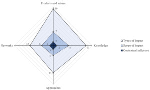 A spider plot was constructed to illustrate the distribution and co-occurrences of the evaluation of impact types, impact scopes, and contextual influencing factors (Figure 3). Like Figure 2, Figure 3 showed a predominance of evaluating tangible impact types, and revealed less attention paid to the scope of impact and contextual influencing factors than to the assessment of impact type, as highlighted by the small overlap of the shaded areas. Figure 3 also illustrates the co-occurrences between evaluation domains, unveiling the evaluation arenas, expressed in terms of the types of impact brought by LLs, wherein impact scope and contextual influences were assessed. More specifically, there was a trend towards measuring the extent of impact when the impact was tangible. For instance, authors more frequently described and measured the extent of impact when LLs provided new products and values (n = 7) or new knowledge (n = 8). Conversely, studies less frequently assessed the extent of intangible impact, such as on approaches and visions (n = 6) or on networks (n = 6). Figure 3 also suggested that studies proportionally measured the extent of impact more when it was an intangible impact compared to a tangible impact. For instance, 50.00% of network impact studies measured the extent of impact, while only 36.84% of LLs that produced new products and values took the scope of impact into account. Finally, although consideration of contextual influences is the least represented dimension, it appears to be evenly distributed between the different types of impact.