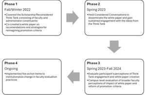 The project unfolded in four phases. First, we brought together a think tank with the aim to co-create a white paper (Phase One). We then engaged in considered conversations with additional constituents and to ensure wide engagement with the white paper (Phase Two). Next, we did a “member check” with the participants to measure their level of engagement and the success of our think tank, as well as an overall faculty evaluation to gauge campus sentiment regarding the concepts and processes outlined in the white paper (Phase Three). Lastly, we implemented some of the strategies proposed by the white paper to institutionalize some of the transformational changes (Phase Four).