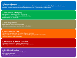 While the primary focus of this article is the description of the reward recognition of community-engaged scholarship at CE-classified institutions, we hope that our methodological approach can also be instructive to both researchers and practitioners. Artificial intelligence (AI) is still in its relatively nascent stages, but we believe it can be a useful research tool when utilized responsibly. We did not use AI as a replacement for our own insight and experience, but largely as a way to help organize our data to allow for more efficient analyses. We also want to emphasize the importance of transparency when using AI tools for research and scholarship, which helps to demonstrate trustworthiness and allows for repeatability.