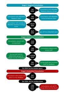 During this first survey drafting stage, various PPI groups were consulted to gather opinions on whether there was a need for a #BeeWell school provision survey, and if so, their advice on what the content of the survey should be. The #BeeWell Research Advisory Group, as well as the #BeeWell Research, National, and School teams were initially separately presented with a proposal for the survey which contained a rationale detailing the need for the survey, a plan for survey launch, and the draft survey topics and questions. These groups provided feedback on these aspects, along with other possible modules which could be included within the survey. The survey draft was subsequently updated. Further consultation with school staff took place at the #BeeWell Headline Findings Event in March 2024. Official sign-off from the #BeeWell teams was provided thereafter.