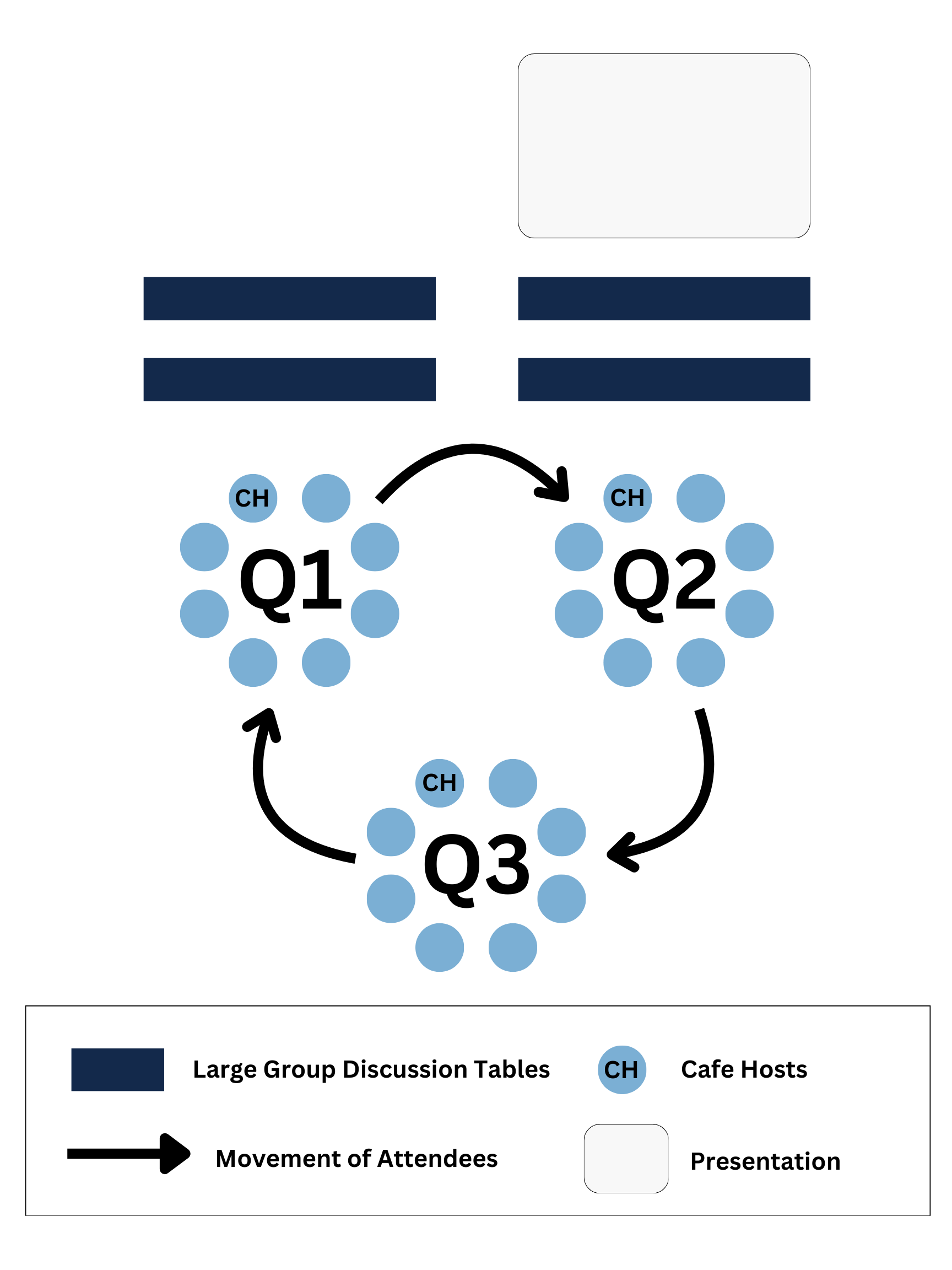 TWC attendees rotated through each question once at 10- minute intervals for a total of 30 minutes, while café hosts remained at their designated table throughout the small group discussion period. Figure 1 depicts the approximate setup and movement of attendees. At the start of each rotation, café hosts summarized what was discussed by attendees in the previous round. This allowed each new group to corroborate and/or contest discussion points by relating themes to their own personal and professional experiences and beliefs (Brown & Isaacs, 2005; Shiele et al., 2022).