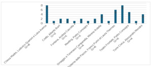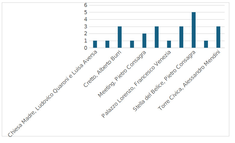 After an individual map-by-map analysis, the 26 productions were analysed using Atlas.ti software, coding the elements present in each of them for a cross-referenced study. The graph below (tab.4) shows the results of the first sensitive mapping workshop, where it results that certain artworks were mentioned by most of the participants, such as the Chiesa Madre and the Stella del Belice, mentioned 8 times, the Sistema delle Piazze, mentioned 6 times, and the Teatro Frontale, mentioned 5 times.