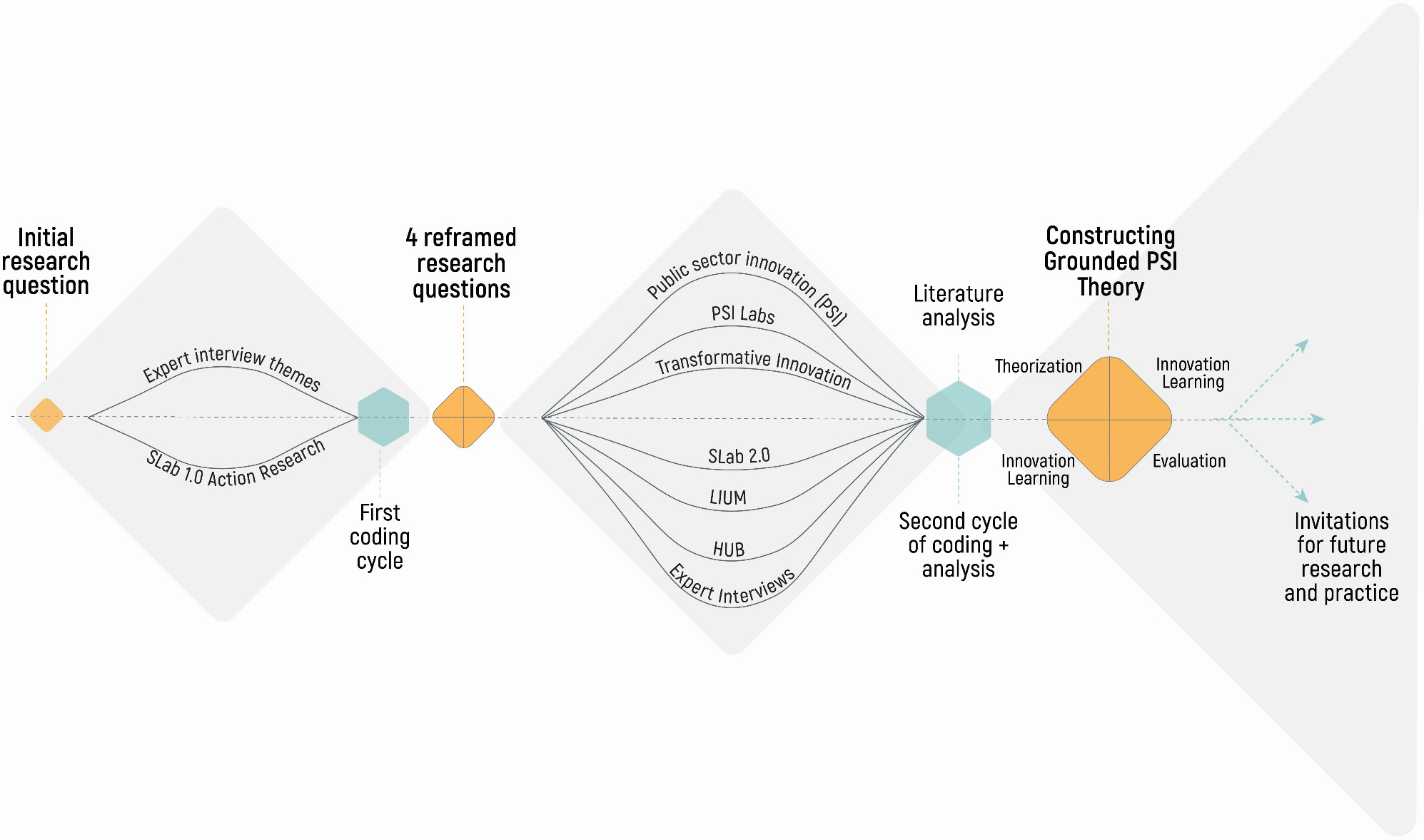 This article explores how and why an assemblage of critical, qualitative research methods—using participatory action research (PAR) and constructivist grounded theory (CGT) as the backbones—was constructed and used to study the rapidly-emerging field of public sector innovation (PSI) labs. The origins of this work are rooted in my dual roles as practitioner and researcher in the field of public sector innovation. It is also rooted in my desire to support higher-impact public sector innovation lab practice in a way that is not possible when consumed by the day-to-day pressures of developing and running an individual PSI lab. This dual role and desire, a deep commitment to co-creative research that generates insights useful for practice, and my own views and experiences of what public sector innovation should be working toward, required a research method that harnessed this positional complexity as a strength while providing rigor and quality in ethics, process, and outcomes.